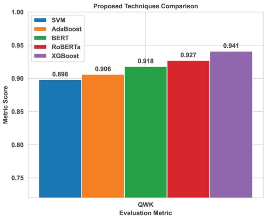 The results in Table 9 indicate that while each feature type alone contributes significantly to the model’s performance, the highest QWk is achieved when handcrafted and RoBERTa features are combined. Specifically:
