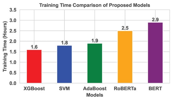 When comparing the time complexity and scalability of the proposed hybrid approach using LwXGBoost with other methods, LwXGBoost stands out for its efficiency in handling large datasets, utilizing parallel tree boosting, out-of-core computation, and regularization techniques. These features allow LwXGBoost to scale with O(n log n) time complexity, making it more efficient than models like SVM and AdaBoost, which struggle with high-dimensional data. SVM, in particular, experiences a significant increase in time complexity as data size grows, making it less suitable for large datasets as its time complexity is also . In contrast, while powerful for capturing semantic features, BERT and RoBERTa embeddings have a time complexity of due to the quadratic scaling with input sequence length, resulting in high computational costs for training and inference on large datasets. However, LwXGBoost efficiently manages the high-dimensional feature space produced by combining RoBERTa embeddings and handcrafted features, leveraging its distributed computing capabilities to maintain scalability even with complex datasets like ASAP. Compared to AdaBoost, which incurs higher computational overhead as weak learners increase, LwXGBoost remains more time-efficient and scalable, particularly in large-scale essay-scoring tasks. Figure 12 shows the best model training time comparison.