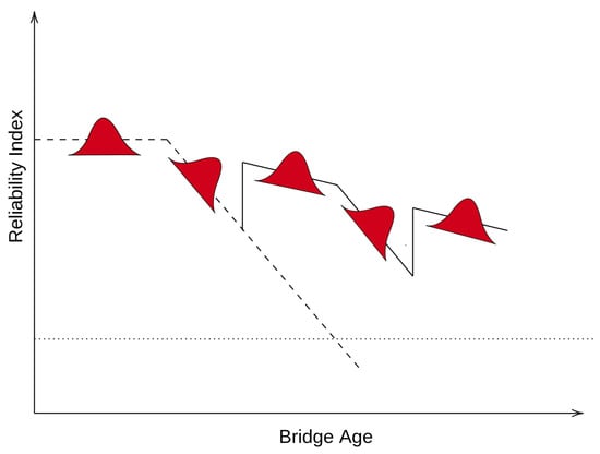To model the natural aging process of a bridge, the decrease in reliability can be modeled as proposed by Frangopol et al. [] (Figure 1). For each bridge, the reliability index can be specified as a combination of two parameters, an initial reliability  and a decaying rate . At any time, an intervention improves the reliability of a certain amount  and, for a limited time interval, yields an improved decaying factor .