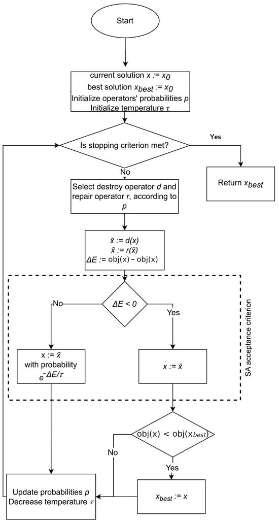 Adaptive Large Neighborhood Search (ALNS) is a metaheuristic algorithm proposed for solving complex optimization problems. Introduced by Ropke and Pisinger [], ALNS generalizes Large Neighborhood Search (LNS). LNS is a heuristic algorithm that iteratively modifies an initial solution  with two distinct procedures, one that introduces random perturbations to x, named destroy operator, and a repair operator whose purpose is to optimize the perturbed solution to yield improved performances. Unlike LNS, ALNS implements several destroy and repair operators, respectively collected in sets D and R, to explore the solution space more broadly. According to its optimization strategy, ALNS randomly selects two operators from D and R to modify the current solution x at each iteration. Throughout the process, the randomized choice of the heuristics uses selection probabilities related to the past success of each operator.