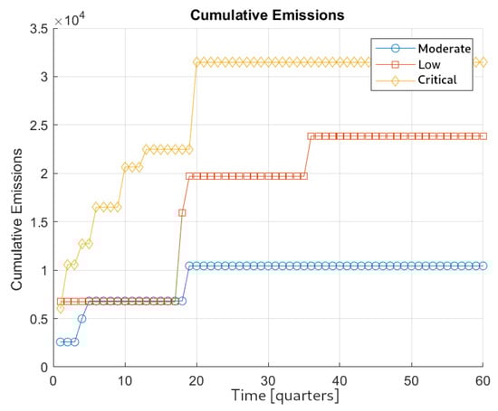 Evolution of the cumulative emissions over the time horizon for the three scenarios.