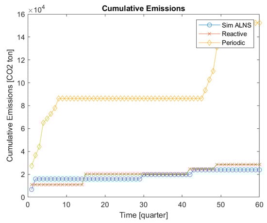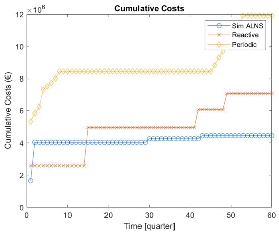 Analyzing the results, the first behavior that can be pointed out is that periodic maintenance is the strategy characterized by the least competitive performance. This is widely expected, as also pointed out in the scientific literature, since the fixed-time schedule of periodic maintenance often results in frequent and unnecessary maintenance operations. Therefore, this property is reflected in both the economic cost and the emissions related to this approach, which are significantly larger than those achieved by both Sim-ALNS and the reactive strategy in all scenarios.