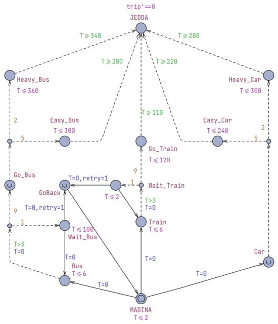 As illustrated in Figure 1, the Stochastic Priced Timed Game (SPTG) model captures the decision-making process of travelers choosing among different transportation options from MADINA to JEDDA. The XML code corresponding to the UPPAAL model of this traveler decision-making framework is provided in Listing A1 in Appendix A. The journey begins at the initial state, MADINA, represented as a double circle, indicating it is the starting point of the traveler’s experience. From MADINA, the traveler has three transportation options: bus, car, and train.