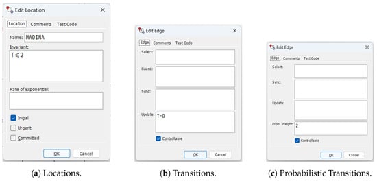 Figure 2a illustrates that by clicking twice on a location, a configuration window appears, allowing users to update various parameters of the location, including its name, invariant, rate of exponential decay, and type (Initial, Urgent, or Committed). Additionally, small nodes within the model are referred to as branching states. Figure 2b demonstrates that by clicking twice on a transition, a configuration window allows for the definition of the transition’s guard conditions and the specification of whether the transition is controllable. Controllable transitions are depicted with continuous lines, while non-controllable transitions are represented with dotted lines, signifying their different roles in the model’s behavior. Finally, Figure 2c focuses on probabilistic transitions, where users can assign weights to each transition. These probabilistic transitions emanate from branching states, indicating the likelihood of taking specific paths within the model based on defined probabilities.