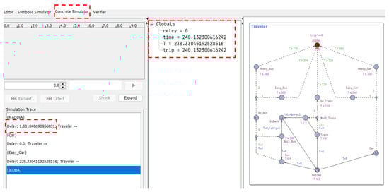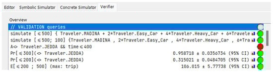 In our analysis, we utilized both the symbolic and concrete simulators provided by UPPAAL to explore the behavior of the SPTG model. The symbolic simulator allows for the efficient exploration of the state space by representing states and transitions symbolically, thus enabling the analysis of larger models without exhaustive enumeration. This mode is particularly useful for understanding the overall system dynamics and verifying properties over a wide range of scenarios. In contrast, the concrete simulator focuses on executing specific instances of the model, providing detailed insights into individual paths and real-time behaviors. This mode is essential for validating the model against expected outcomes and for observing the effects of different variables in concrete situations. Together, these simulators offer a comprehensive toolkit for analyzing the complex interactions within the transportation model.