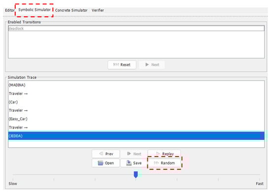In both simulation modes, the symbolic and concrete, we can adopt either an interactive or random mode, providing flexibility in exploring the model’s behavior. Additionally, the obtained trace can be exported for later analysis and replayed to review specific scenarios. During simulations, we have access to the values of global variables, allowing for real-time monitoring of the system’s state. In the concrete simulation mode, actions occur after specific delays, as illustrated in Figure 3. During the simulation, the current state is highlighted in red, making it easy to identify the active state of the model at any given moment. Figure 4 illustrates the symbolic simulation process, showcasing how the state space is explored efficiently.