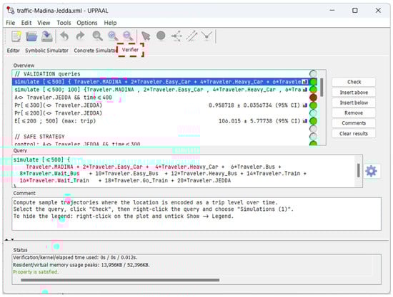 - The queries for the Safe Strategy are shown in Figure A1. The analysis begins by defining a control property that evaluates whether the traveler can select modes of transport to reach JEDDA within 400 min, irrespective of traffic conditions. Next, the tool is utilized to produce the GoSafe strategy, a fully permissive approach that meets this control property. Following this, the feasibility of reaching JEDDA within 400 min under the GoSafe strategy is assessed. This is accompanied by an estimation of the time required for the journey, with the clock time paused during this evaluation. Finally, an overview is generated to illustrate the allocation of time and the specific points at which time is spent while employing the GoSafe strategy.