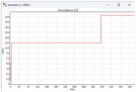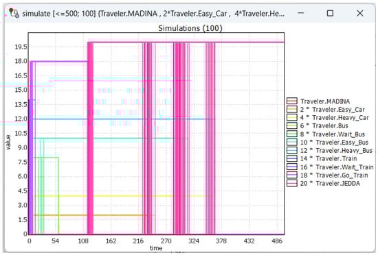 - Simulation Graphs: Visual representations showing the occupancy of different nodes over time, illustrating how the position of the traveler changes throughout the simulation. In the considered model, only one node can be occupied at any given time. When a transition is firable, an action will be taken, and the traveler will move from the current node to the destination node of the considered transition. This contrasts with models like timed Petri nets, where multiple nodes can be occupied simultaneously by tokens, allowing for a more flexible representation of states and transitions [37,38,39,40]. For more complex scenarios, the system may consist of a product of timed automata. In this case, the current state of the system is represented by the combination of the currently occupied nodes in each individual automaton. This means that the overall state reflects not just the position in one automaton but rather the collective state across all automata involved, providing a comprehensive view of the system’s dynamics. For instance, Figure 7 and Figure 8 are two possible simulation graphs for the query Q1. In the first case, the traveler reaches the final destination in approximately 185 min, while in the second situation, the trip takes approximately 370 min. Figure 9 corresponds to one hundred possible simulations, satisfying the query Q2. The horizontal axis corresponds to the progress of time, while the vertical axis indicates which node is currently occupied by the traveler. We used a different weight for each node in the model; for instance, the MADINA and JEDDA nodes take the lowest (0) and highest (20) weights, respectively. The other nodes take values of 2, 4, 6, …, 18. A step of 2 is taken between each two consecutive nodes to enhance clarity. Additionally, a different color is used for each node, and the sudden switch from one level/color to another corresponds to the move from one node to another. The horizontal lines represent the situation when the system is at the same node. For example, the blue vertical lines indicate the transition of the traveler from the MADINA node to the train node, while the horizontal blue lines denote the durations spent at this node. Next, the purple vertical lines represent the transition to the Go_Train node, with the horizontal purple lines indicating the time spent there. Subsequently, the pink vertical lines correspond to the arrival at the JEDDA node, and the horizontal pink lines show the duration spent at this node. It is also important to note that certain strategies do not allow for reaching the JEDDA destination. For instance, the green horizontal lines associated with the Wait_Bus node lack continuity, indicating that it is not possible to reach the destination from this node given the considered constraints. The figure shows that, in most cases, the time for reaching the destination is between 270 and 324 min. This range is likely associated with the use of a car for travel, as this mode of transportation minimizes the risk of waiting for public transport and eliminates unnecessary delays. Consequently, the traveler experiences a more direct and efficient journey, resulting in the observed time frame.