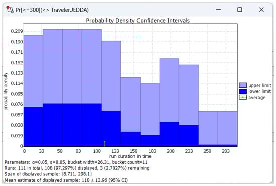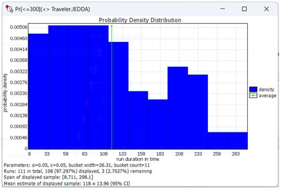 - Probability Density Distribution: A function that describes the likelihood of a random variable falling within a particular range of values, providing insight into the distribution of outcomes. In the context of UPPAAL Stratego, this distribution plays a crucial role in analyzing the performance of stochastic systems. It allows for the evaluation of various strategies by quantifying the probabilities associated with different outcomes, such as the time to reach a destination or the likelihood of encountering specific events. By leveraging the probability density distribution, researchers can make informed decisions about optimizing strategies in uncertain environments, thus enhancing the overall efficiency and effectiveness of the modeled system. For instance, the probability density distribution for the query Q4 is shown in Figure 10. We can observe that the probability density reaches its maximum during the duration between 33 and 108 min. Following this peak, it decreases gradually within the interval from 108 to 183 min. Afterward, it experiences another increase before declining once more.