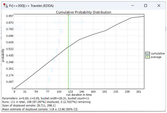 - Cumulative Probability Distribution: A function that indicates the probability that a random variable takes on a value less than or equal to a specific value, useful for understanding the likelihood of outcomes up to a certain point. In the context of UPPAAL Stratego, the cumulative probability distribution is instrumental in analyzing the overall performance of stochastic systems. It provides a comprehensive view of the probabilities associated with various outcomes, allowing researchers to assess how likely it is for a traveler to reach a destination within a certain time frame. This distribution not only aids in evaluating the effectiveness of different strategies but also highlights critical thresholds that can inform decision-making processes, thereby enhancing the strategic planning in uncertain environments. The cumulative probability distribution for the query Q4 is shown in Figure 12. We can observe that the slope of the curve representing the cumulative probability density distribution remains constant until 123 min. It then decreases and stays stable until 192 min. At this point, it increases again before experiencing a final decrease between 238 and 261 min.