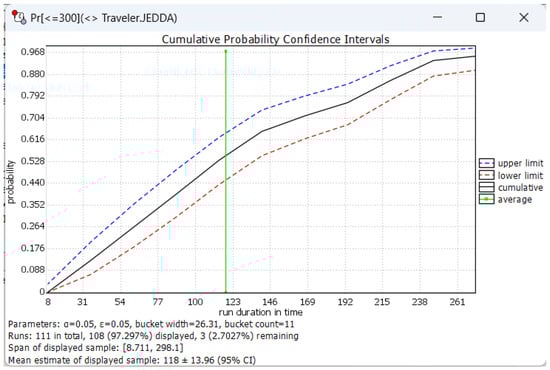 - Cumulative Probability Confidence Intervals: Ranges that provide an estimate of uncertainty around the cumulative probability distribution, indicating where the true cumulative probabilities are likely to fall. Within the framework of UPPAAL Stratego, these confidence intervals are essential for quantifying the reliability of cumulative probability estimates. They allow researchers to understand the degree of uncertainty associated with the predicted cumulative outcomes, offering insights into how robust different strategies may be. By examining these intervals, decision-makers can better assess the likelihood of achieving desired results, thus facilitating more informed planning and optimization of systems under uncertain conditions. An example for the query Q4 is given in Figure 13. We can observe that the upper limit, lower limit, and cumulative probability density confidence intervals exhibit nearly identical shapes.