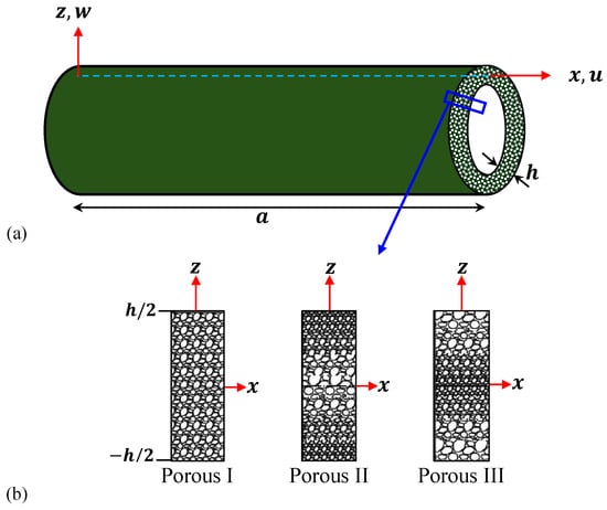Figure 1a shows an FG porous microtube of length a and wall thickness h. The microtube is composed of PEMs with internal porosities that may be evenly or unevenly dispersed. According to the MCST [] and PEMs theory [], the change in the strain energy  involves the strain tensor , curvature tensor , and electric field , as follows: