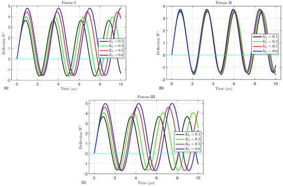 For three different porosity distributions (Porous I, II, and III), the effects of the porosity coefficient  on the nonlinear central deflection  of the FG porous piezoelectric microtubes are illustrated in Figure 2a, Figure 2b, and Figure 2c, respectively. It is evident that the lengths of the deflection waves of the Porous I and Porous III types increase with increasing porosity factor, whereas for the Porous II type, the wave length decreases as  increases. Because the increase in the porosities weakens the strength of the microtube, the amplitude of the deflection increases with increasing porosity coefficient. It can also be seen that the effect of the porosity factor on types I and III is more pronounced than on type II, because the porosities in the first and third types are more than those in the second one.