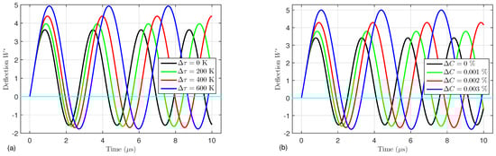 Effects of the (a) temperature change  and (b) moisture change  on the dynamic deflection  of an FG porous microtube ().