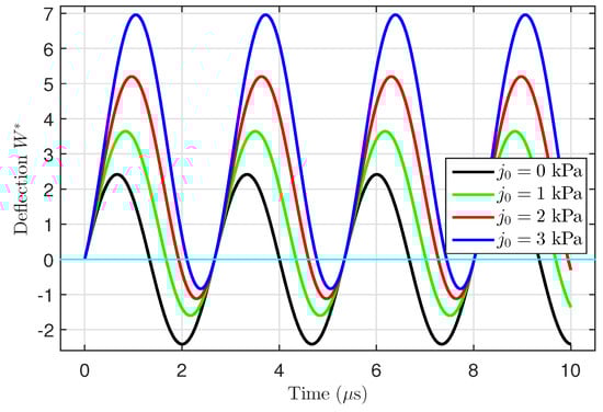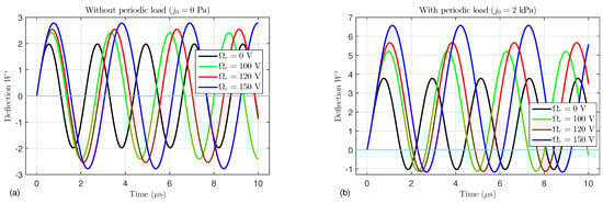 The effects of the external electric voltage  on the time-dependent deflection  of the FG porous microtube without periodic load () or with periodic load ( kPa) are illustrated in Figure 4. It is evident that, in the absence of the periodic load, the governing equations become a homogeneous system that gives symmetrical waves about the axis . On the other hand, the waves have been displaced upwards by applying the periodic load. It is noticed that by increasing the external electric voltage, the displacement increases.