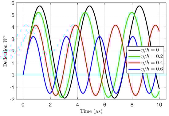 Figure 6 investigates the effects of the material length scale parameter  on the time-dependent deflection  of the FG microtube. It can be observed that the increase in the material length scale parameter  makes the tube stiffer, so the deflection decreases as the material parameter  increases.