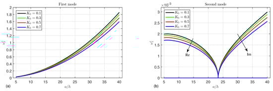 In this section, the fundamental frequencies of the FG porous microtubes are discussed under the effects of different parameters. From Equation (44), we have four eigenfrequencies . The first solution  is called the first mode, and the second one  is called the second mode. Note that the first mode of the eigenfrequency is purely real, while the the second mode is complex. For further clarification, the real Re and the imaginary Im parts of the second mode are discussed.