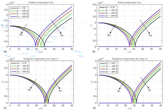 In contrast, Figure 9 displays the impact of the temperature change  on the second mode of the frequency for different temperature types: (a) uniform temperature rise, (b) linear temperature rise, (c) nonlinear temperature rise (type 1) and (d) nonlinear temperature rise (type 2). It is noted from this figure that the real part reduces by increasing the temperature while the imaginary part increases by also increasing the temperature. Furthermore, the critical points noticeably depend on both the temperature type and temperature value.