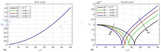 Figure 10 depicts the effect of the moisture change  on the first and second modes of the frequency. The moisture loses its influence in the first mode, but it is more pronounced in the second mode. It is noted from this figure that the real part decreases with increasing humidity and becomes zero at the critical points that occur at , 23.3, 21.1, and 19.4 for , , , and , respectively. On the other hand, after the critical points, the imaginary part increases as the moisture increases.