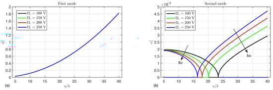Effects of the length-to-thickness ratio  and external electric voltage  on the (a) first mode and (b) second mode of the frequency ().