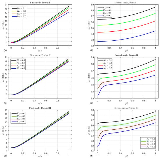The wave frequencies against the material length scale parameter  for various values of the porosity factor  considering different porosity distribution types (a) first mode of porous I, (b) second mode of porous I, (c) first mode of porous II, (d) second mode of porous II, (e) first mode of porous III, and (f) second mode of porous III.