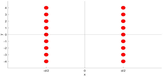 For a double array, the origin of the coordinate system is set so that the system is symmetric under reflection in the plane, , as shown in Figure 1. In the long wavelength approximation, the convolution in the Lippmann–Schwinger equation is computed in the same way as in the single array case using the values of and at the centers of the cylinders. The Bloch condition shows that these values are determined only by their values at , that is, by and .