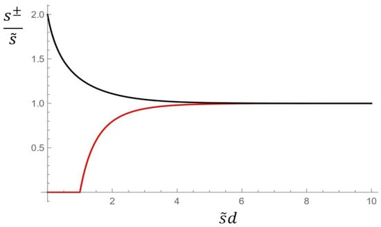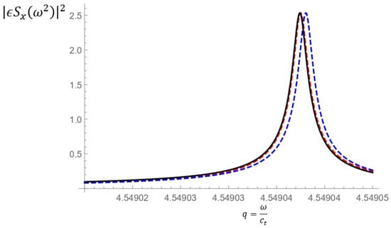 Following the strategy outlined in Section 2.3, the first objective is to solve the equation in the complex plane of . Unfortunately, this task is not analytically tractable for general parameters of the theory and only numerical methods apply. However, if the equation can be solved for a single array, either analytically or numerically, then the equation for the double array can be studied analytically in the so-called Fabry–Pérot approximation that was used to find electromagnetic and elastic BSC in [3,39], respectively. In this approximation, the distance d between the arrays is assumed to be much larger than the wavelength of the incident wave . If the distance between the arrays is large enough, then the scattering on the double array is dominated by the resonances of each array that are coupled only via propagating modes, while evanescent fields generated by each array can be neglected in the vicinity of the other array because evanescent fields decay exponentially with increasing distance from the array. The latter follows immediately from the explicit form of given in (A4). So, in this approximation, each array emits a wave that also scatters on the neighboring array so that the outgoing wave in the asymptotic regions is a superposition of multiply scattered waves like in a Fabry–Pérot interferometer. If, in addition, the scattering on a single array is proved to be resonance dominated (a background scattering can be neglected), then the amplitudes of the scattered waves are uniquely determined by the position and width of the single array resonance just like in the partial wave summation for a Fabry–Pérot interferometer. Let us investigate resonances and BSC in the double array using this approximation.