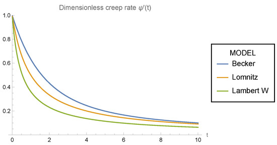 Figure 1 shows the dimensionless creep rate for the Becker (15), Lomnitz (22), and Lambert (33) models. It is apparent that for , is a monotonic decreasing function in all models, with . Also, Figure 1 suggests that for . The latter can be derived very easily by analytical methods, as it is shown in Appendix C.