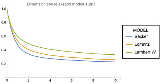 In addition, we have compared all the models in terms of the behaviour of the dimensionless creep rate in Figure 1, as well as the dimensionless relaxation modulus in Figure 2, and the spectral functions and in Figure 3 and Figure 4. From these graphs, we can appreciate that all the models are asymptotically equivalent, although not at the same rate. It is worth noting that the Becker model presents a discontinuity in the retardation spectral functions and at , which is not present in the other models.
