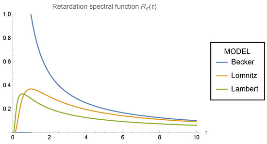 Figure 3 presents the retardation spectral function for the Becker (20), Lomnitz (29), and Lambert (37) models. It is worth noting that the graphs corresponding to the Lambert and Becker models verify the inequality derived in (40), i.e., for .
