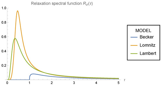 In Figure 4, the relaxation spectral function is plotted for the Becker (21), Lomnitz (30), and Lambert (41) models. Despite the fact that the plots for and are quite similar for all the models, there is a great qualitative difference between the Becker model, and the Lomnitz and Lambert models with respect to the spectral functions and , since the Becker model shows a discontinuity at , but we have continuous functions for the other two models.