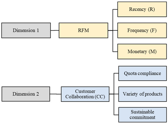 Figure 4 shows the hierarchy of criteria with two relevant dimensions, which integrate three evaluation criteria each, to carry out the customer classification. The first dimension corresponds to RFM, with an economic focus, allowing for the assessment of the customer’s transactional performance by considering the time elapsed since the last purchase (recency), the frequency of purchase in the period evaluated (frequency), and the amount of purchase in that period (monetary).