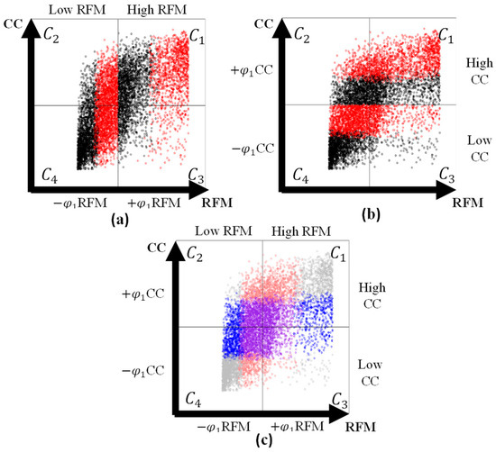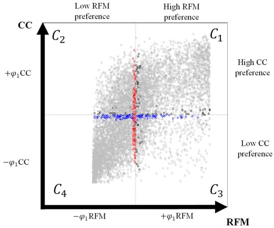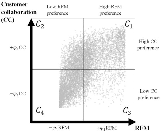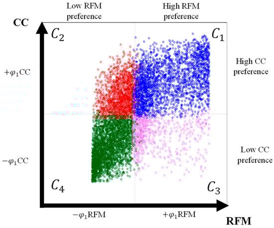 Figure 8 shows the scatter plot of the final classification of 8157 customers into four groups generated by RFM and CC dimensions. The colour labels represent the final classification, and the plotted net flow values for each customer correspond to the global search. Marked in blue are 2746 customers classified in group , with high preference in RFM and CC. In red, there are 1478 customers classified in group , sharing characteristics of high preference in CC and low preference in RFM. In total, 796 customers marked in purple were classified in , characterised by high preference in RFM and low preference in CC. Finally, 3137 customers classified in were labelled in green; these customers share characteristics of a low preference for both dimensions. Considering that both axes have the same weight in the evaluation, it can be concluded that group is preferred over group . However, preference between other groups cannot be established based on the results obtained in the RFM and CC dimensions.
