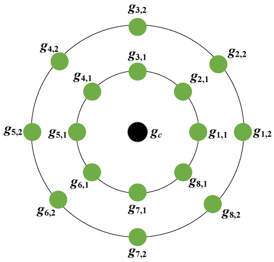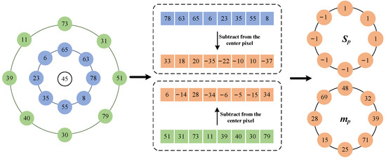 First, to quantify the relative relationships among pixels in these directions, we compare the magnitude of each pixel within the neighborhood with that of the central pixel and construct a binary string along the direction, which represents the relative information of that direction. In this example, we select circular neighborhoods with two different radii ( and ) to acquire the neighboring pixels (r = 1) and (r = 2) in these circular neighborhoods. represents the directional neighboring pixel in the direction. For R neighboring pixels in one direction, an R-bit binary code is generated. Here, each bit (0 or 1) directly reflects the grayscale value change relative to the central pixel in a specific direction.