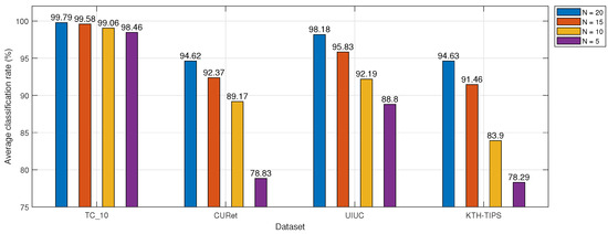 Figure 6 displays the average classification accuracy when the number of training image samples varied across different datasets. For each class within the dataset, N images were randomly selected as training samples, while the remaining images served as test samples. It can be observed in Figure 6 that as the number of training samples decreased, the classification accuracy of the LDDRD generally declined. This is because fewer training samples usually lead to a decrease in the generalization ability of the descriptor. With a training sample size of N = 20, the LDDRD demonstrated the best performance, achieving classification accuracies of 99.79%, 94.62%, 98.18%, and 94.63% on the respective datasets. Additionally, on the TC_10 dataset, the accuracy did not notably decrease as N decreased, with the drop being maintained at 1.33%. This indicates that the LDDRD possesses a degree of flexibility, allowing it to adjust the value of N based on actual conditions. This flexibility enables the LDDRD to reduce computational time without excessively compromising classification accuracy.