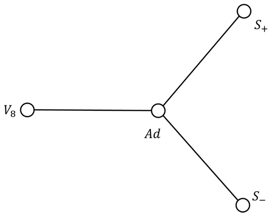 Dynkin diagram of the simple Lie group , where the nodes of the diagram correspond to the vectorial representation and the spinor representations and of , corresponding to the two types of spinors in dimension 8, known as Weyl spinors (which are 8-dimensional and interchanged by the action of the triality automorphism) and the adjoint representation Ad (which is 28-dimensional and fixed by the action of triality) [30]. The figure is original and was made using Microsoft Word® v. 2409.