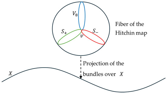 Roughly speaking, the triality automorphism of acts in each fiber of the Hitchin map by permuting the orbits corresponding to the three 8-dimensional irreducible representations of mentioned above (the vectorial version and the two spinor versions, positive and negative, corresponding to the Weyl spinors [30]). In Figure 2, a generic fiber of the mentioned Hitchin map of the moduli space of -Higgs bundles over the compact Riemann surface X is represented, and three orbits interchanged by the triality automorphisms are shown in a very simple and schematic way. The point called v in the intersection of the orbits represents a fixed point of the action of triality on the fiber.