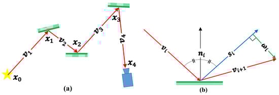 Therefore, it is convenient to choose a phase space where the deviations from the direction of the specular reflection are independent variables, i.e., are included in the vector representing the ray path. These deviations can be described in different ways: for example, through the vector , defined as shown in Figure 2b. For the first ray segment, there is no previous ray and its specular reflection, so the first segment must be specified explicitly, for example, through its direction .