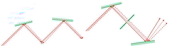 The importance function for our three-segment path is the product of two BDFs and cosines at the two reflection points. It is therefore determined by the directions of the segments and the surface normals. So, to calculate the gradient of the potential, we need the derivatives of the segment directions and the normals with respect to the state vector in our phase space. We used numerical (finite-difference) differentiation with respect to the four elements of (two for the displacement of in two perpendicular directions and two for the displacement of in two directions perpendicular to the specular direction ). When calculating the constraint matrices, we need the derivatives of the angles (the angles between the scattered ray and the direction of mirror reflections for the 1st and the 2nd ellispoids) and the point where the second segment intersects the plane of the diaphragm (Formulas (25) and (28)). They were also found by numerical differentiation with respect to the same four variables. Finally, the divergence term includes the derivatives of also calculated by numerical differentiation.
