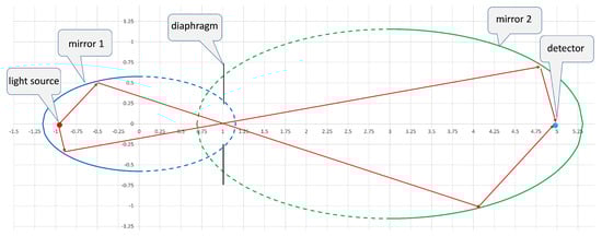 The benchmark scene shown as a projection onto the Oxz plane with the z-axis directed to the right. Elliptical mirrors 1 and 2 are shown in blue and green, respectively. The clipped parts of ellipsoids (absent in the scene) are drawn with the blue and green dotted lines. The right focus of the left ellipsoid and the left focus of the right ellipsoid coincide. The thick black line is the diaphragm with a hole in its center; its plane passes through the coinciding focuses. The light source is located at the left focus of ellipsoid 1 (red dot), and the point detector is at the right focus of ellipsoid 2 (blue dot). Red arrows show possible three-segment light paths.
