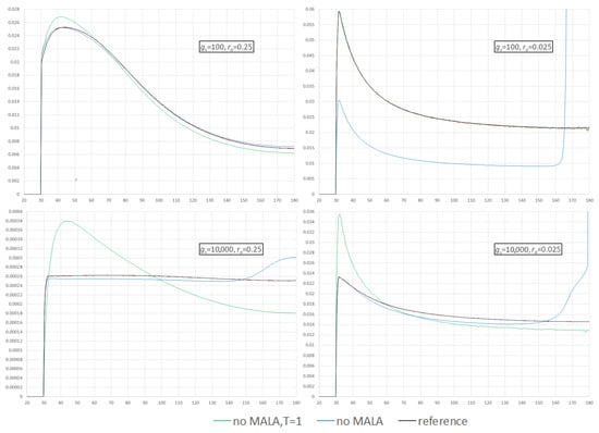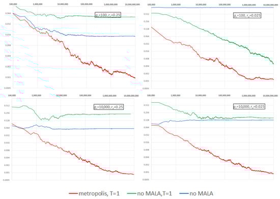 - no MALA: Difference scheme (4) without the Hastings rule. If the path is impossible after a shift by , then the previous position of the point is retained.