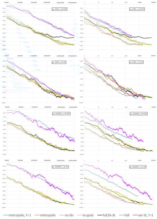 Figure 7 shows how the difference between the accumulated and the reference histograms decreases as the number of time steps increases. It is plotted against the number of time steps and against the processor time spent. For some algorithm modifications, we need more time steps while each is calculated faster, so the convergence may be faster. This is so for the modifications 1–7, i.e., except the last two difference schemes without the Hastings rule. Note that the reference distribution was obtained numerically and therefore has some inaccuracy: about (so this is the low limit of the deviation). The deviation from the reference solution decreases over time for most variants. An exception is the variant of the full Langevin equation with a fixed time step «full, fix dt»; its error saturates and stops decreasing for the parameters (Figure 7, top row).