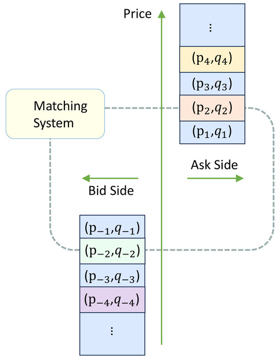 A limit order book (LOB) is a collection of publicly available, aggregated information about limit orders placed by all participants in the market [24]. Limit orders will remain in the order book until executed, canceled, or expired. As depicted in Figure 2, a m level LOB at timestep t is denoted as ;…; ;…;, where and represents the price and quantity at level i on the bid side, and and are the corresponding variables on the ask side. is the best bid price, and is the best ask price. A LOB is a price–time-priority queue pair, i.e., lower sell price orders for the same asset are the most probable to be filled, as are higher bid price orders. If there are two orders with the same price to sell or buy, the first submitted one will be traded first.