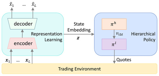 To accomplish better order execution, we propose a novel automatic order execution approach based on hierarchical RL, called OEHRL. An overview of the proposed approach is shown in Figure 3. The proposed approach is composed of two components: representation learning and hierarchical policy learning. As financial data is noisy and stochastic, we need to extract the prominent features from the sequential market data to support effective decision making. Furthermore, since the order execution problem involves two parts, volume scheduling and order placement, and these two parts heavily affect each other, we develop a hierarchical structure to model this influence and learn the order execution policy.