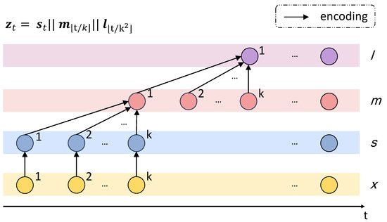 where denotes the approximated posterior distribution modeled by the encoder network , denotes the conditional likelihood distribution modeled by the decoder network , is the prior distribution, L denotes sequence length, and is a scaling factor following the -VAE method. Different from the standard VAE, which only considers learning the embedding from observation , we aim to model the relationship in sequential data, so we take the effect of into consideration, and convert all the distributions in the standard VAE into the distributions conditioned on the sequence as shown in Equation (1). Then, the problem is how to model the past data sequence. The RNN structure provides a good solution, which uses a hidden variable to model with the following recurrence equation: