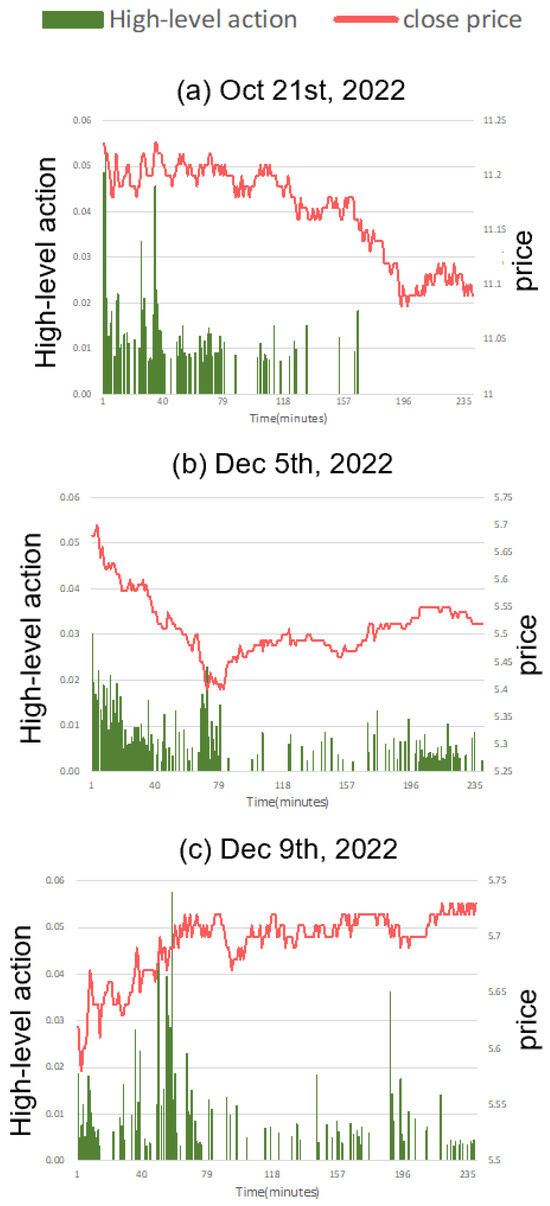 Figure 6 demonstrates the relationship between the high-level action and the closing price trend. The results indicate that these two terms are highly correlated. As shown in Figure 6a, when the closing price is low, in the beginning, the closing price is high, and the high-level policy allocates most of the volume. In contrast, with the drop in the price, the high-level actions are nearly 0. This phenomenon implies that the high-level agent has a price prediction ability to some extent, and can automatically adapt the volume scheduling. Similarly, in Figure 6b,c, we observe that the high-level actions align with the price trend, which gives a positive answer to Question Q2.