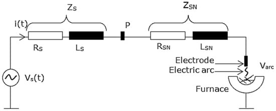 To develop the Simulink model that accurately represents the behavior of the electric arc, as well as the functioning of the electric arc furnace, a simplified electrical supply system for a single phase of the power supply voltage, as shown in Figure 1, was used.
