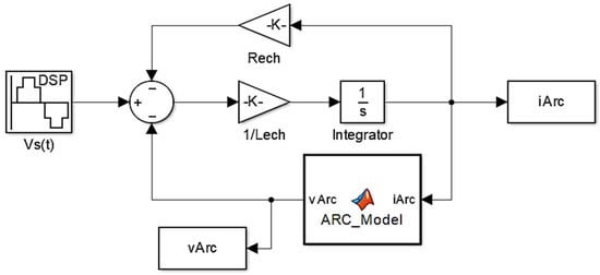 In Figure 2, ARC_Model represents the Matlab function for the model of the electric arc illustrated in Equation (1). In this function, the input is the current of the electric arc and the output is the voltage of the electric arc. In our simulation of parameters Rech and Lech, we used Gain blocks from Simulink.