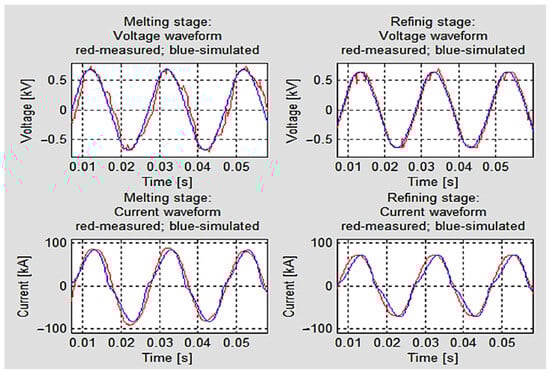 The first comparison, shown in Figure 3, refers to the voltage and current waveforms during the melting and refining stages.
