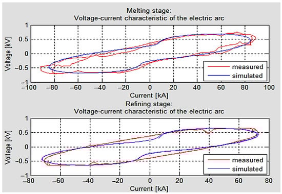 In this paper, a mathematical model of the electric arc that was proposed in [32] is used. This model was validated by making comparisons between the values of the parameters acquired from a real electric arc furnace and simulated values using the same parameters.